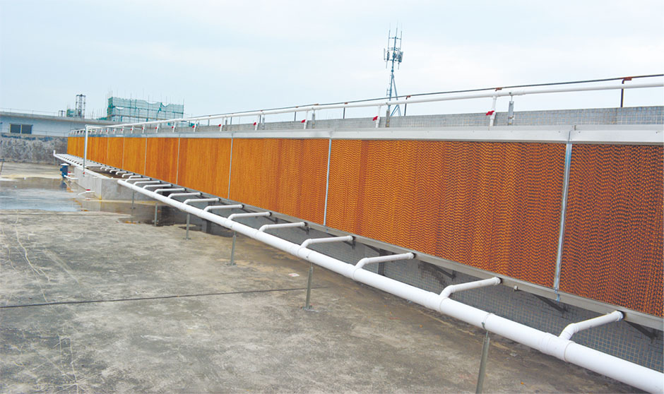 ◆主要材料介绍:水帘降温工程利用和环保空调相同的降温原理,将水帘和负压风机完美结合利用。其利用的蒸发器同样是直接蒸发式换热器“多层波纤维叠合物”水帘是瑞典的专利产品,是经特殊处理的7090型“波纹纤维纸叠合物‘,有良好的吸水性能和通风性能;耐水浸泡不变型;耐腐蚀,正常使用寿命可超过5年。由于其利用水帘面积比环保空调大,所以其降温效果要好于环保空调,可以达到4-13℃的降温幅度。和环保空调降温工程的不同点是水帘降温是针对某个完整且相对封闭的区域,且在水帘厚度方面有100mm和150mm供选择。